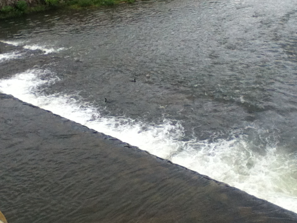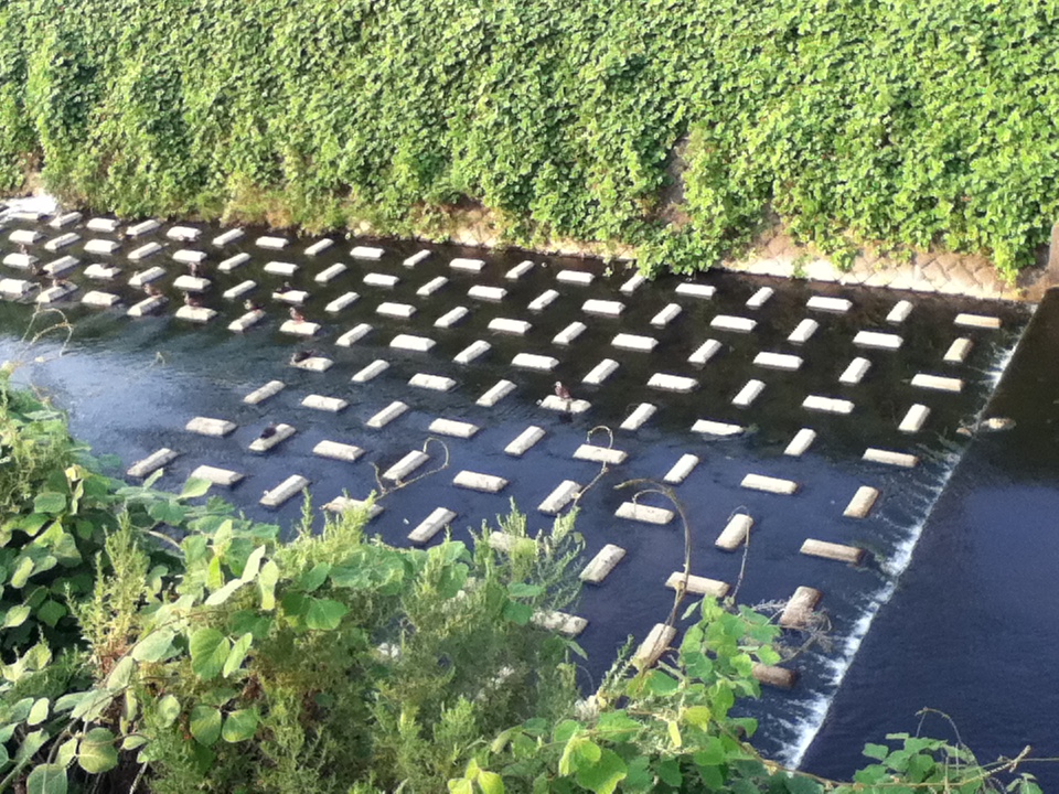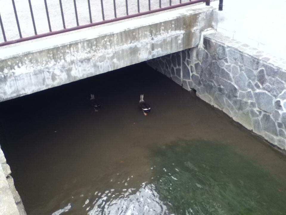 橋の下に逃げ込むカルガモ。。